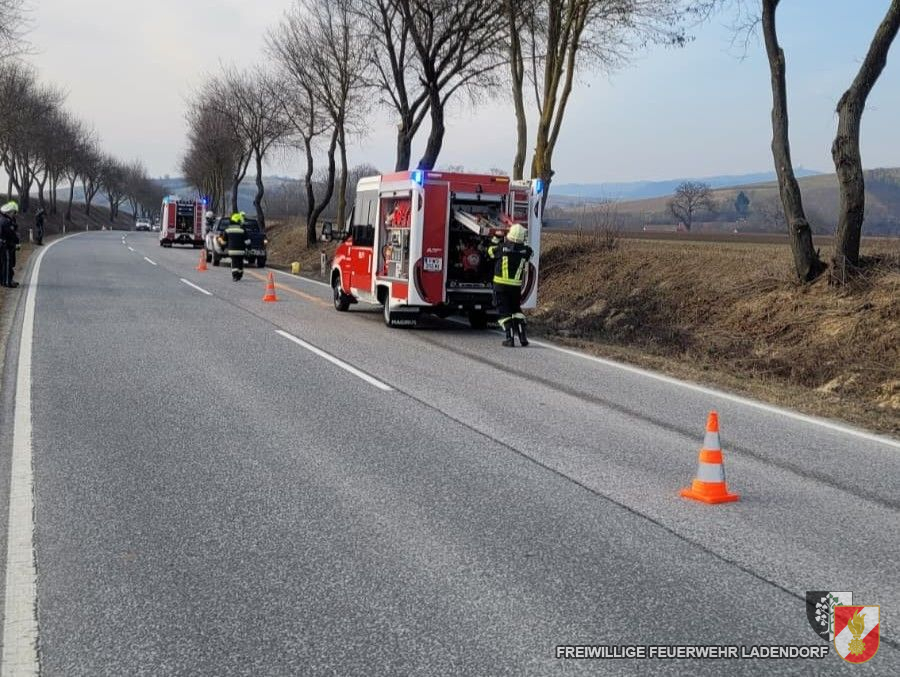 Mittels stillem Alarm wurde die FF Ladendorf zur Unterstützung der FF Eggersdorf bei der Beseitigung einer Ölspur auf der Bundesstraße B40 alarmiert. Nach Absicherung der Unfallstelle konnte das ausgeflossene Öl des PKWs schnell gebunden werden.