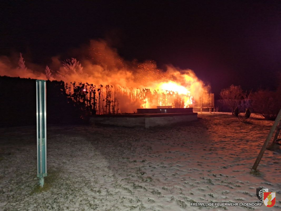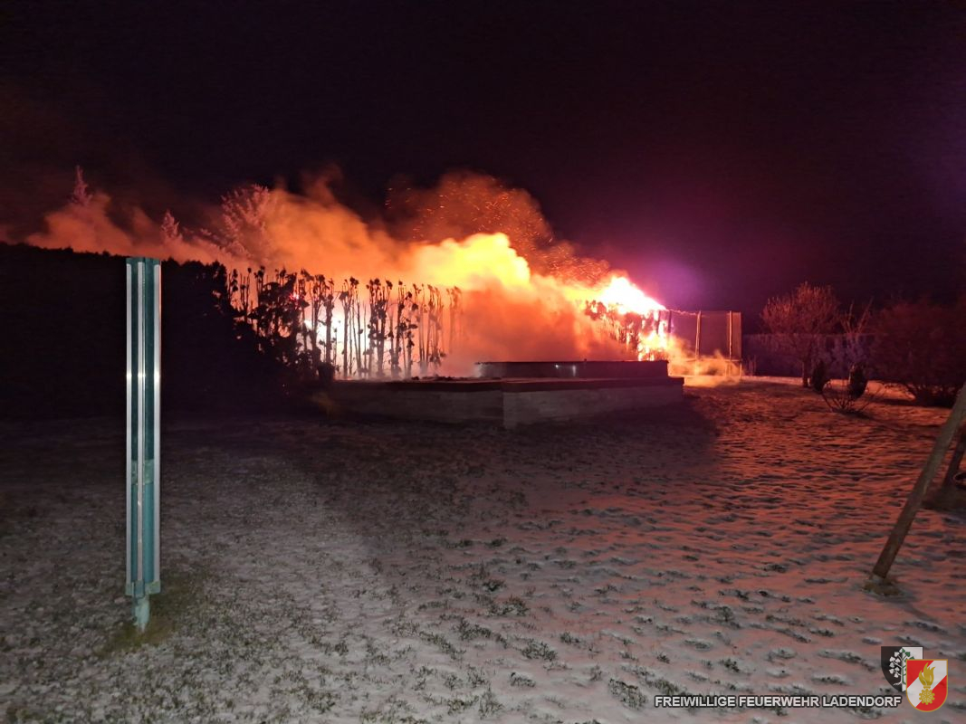 Der Flammenschein war bereits von Weitem deutlich sichtbar, der Funkenflug aufgrund des Windes enorm. Durch das ersteintreffende Fahrzeug wurden umgehend zwei Löschleitungen vorgenommen: Eine zur Eindämmung des Funkenfluges und zum Schutz des angrenzenden Wohnhauses, die zweite zur direkten Brandbekämpfung unter Atemschutz.