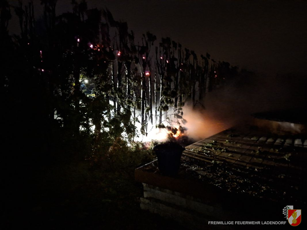 Das Einsatzstichwort „Große Thujenhecke in Brand“ verhieß nichts Gutes. Durch trockene Nadeln sind derartige Brände meist durch einen sehr schnellen Verlauf sowie eine hohe Ausbreitungsgefahr gekennzeichnet. Da sich beim Alarm bereits mehrere Feuerwehrmitglieder im Feuerwehrhaus befanden, konnte unverzüglich ausgerückt werden.